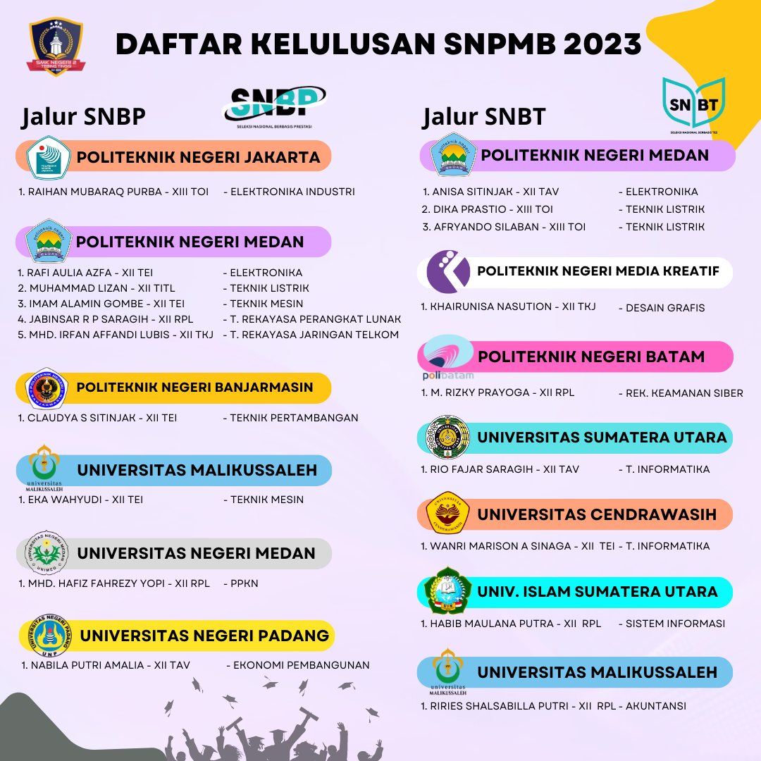 Selamat kepada siswa/i SMK Negeri 2 Tebing Tinggi yang telah berhasil lulus dalam Seleksi Nasional Penerimaan Mahasiswa Baru(SNPMB) Tahun 2023 melalui Jalur SNBP (Seleksi Nasional Berbasis Prestasi) dan Jalur SNBT (Seleksi Nasional Berbasis Tes) di Perguruan Tinggi Negeri dan Politeknik Negeri. Semoga lebih sukses dalam menjalani perkuliahan.