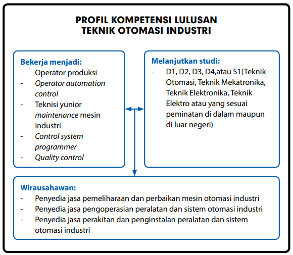 Sedangkan aspek keterampilan, peserta didik diharapkan memiliki kompetensi dalam melaksanakan tugas spesifik, dengan menggunakan alat, informasi, dan prosedur kerja yang lazim dilakukan serta memecahkan masalah sesuai dengan bidang kerja Teknik Otomasi Industri. Menampilkan kinerja mandiri dengan mutu dan kuantitas yang terukur sesuai dengan standar kompetensi kerja. Menunjukkan keterampilan menalar, mengolah, dan menyaji secara efektif, kreatif, produktif, kritis, mandiri, kolaboratif, komunikatif, dan solutif dalam ranah abstrak terkait dengan pengembangan dari yang dipelajarinya di sekolah, serta mampu melaksanakan tugas spesifik secara mandiri.